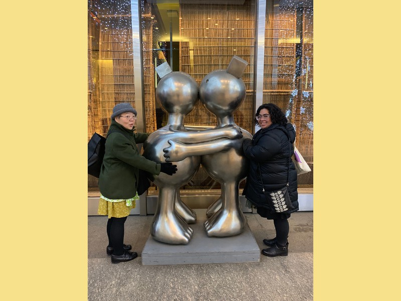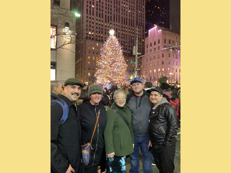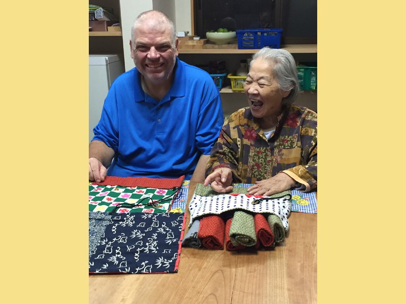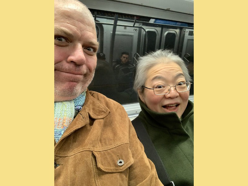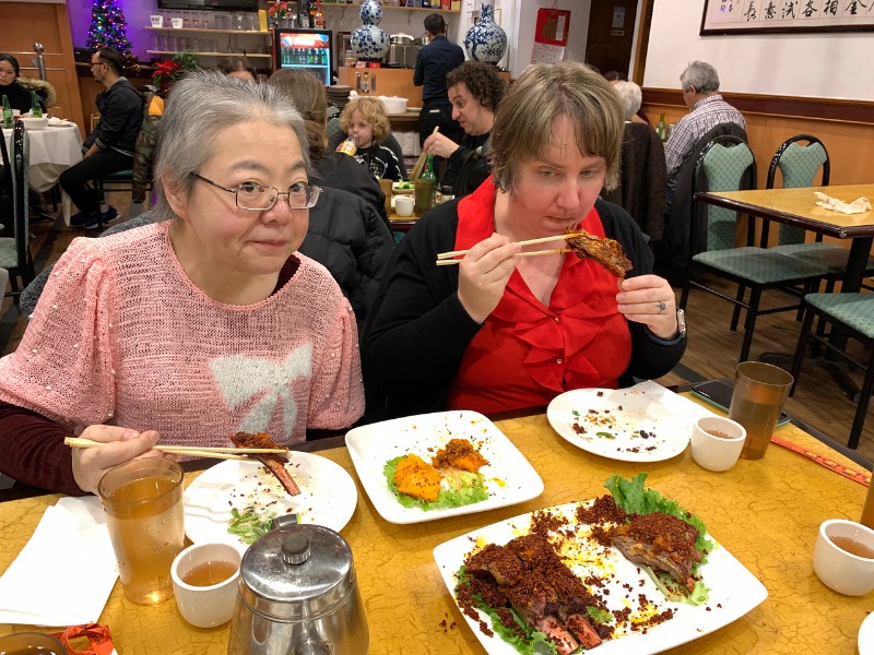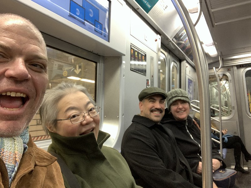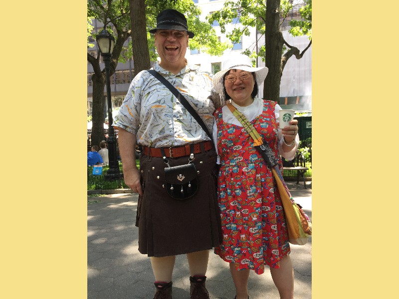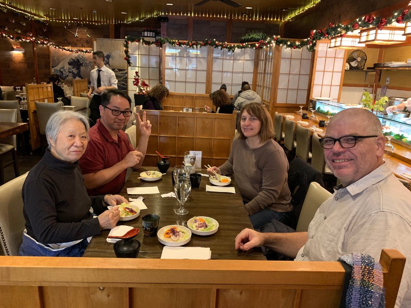 2018 First, elephant on the table! We have changed size we started a big weight loss effort over the past year and between us (with Mom's help), we have lost Muhammed Ali's mass! Maki's boss in Boston has the Leroy Neiman portrait print of Ali, so we took advantage of the opportunity to depict how much that is ... People ask "How did you do it?" and it's pretty simple low carb, but for life. We had some health scares, and it became necessary to finally address our gross tonnage. (On our holiday card doodle, note the funny line on my dress it's a graph of my weight over the past year!) A lot has gone on this year, apart from the usual opera subscription (weekly seats at the Metropolitan Opera House with friends), playing with a dog (just the one!) that isn't ours, visiting the farm in Japan, seeing friends who visit our locale, and visiting others. Bif had a milestone birthday and the SPS crew came to help celebrate. The original plan would have taken us to the far east; but since his age is merely a number, perhaps we shall do it in the coming year instead? We had a very fine dinner and we were so loud that the restaurant was likely relieved that we requested a table far to the back. We've suffered some surgeries this year. Nothing life-threatening but many things are life-altering. Like my carpal tunnel surgeries last year. This year is eyes, kidney stones, glands, cysts, bumps, blah blah blah. (Why so brief in description? Josh's mother says of such discussions, "I am tired of hearing the Organ Recital!" :D agreed!) Maki's favorite aunt (Maki is her favorite child) claimed she was "so sick! and maybe dying!" So we went to Japan ... and found her spritely and bossy. :) Never mind, it's a good reason to go. Plus Maki's cousin Mitihide has started the meets that could qualify him for the Tokyo Olympics, so we attended one while we were there. It also turns out that aunt really only wanted Maki and Brian to bake her pastries and bread! So we bought a small electric oven, since Japanese homes are not normally supplied with such an appliance. Now Mom can cook in Japan more like she does in NYC, too. Win! While in Japan, Mom and Aunt helped us with some of our arts and crafts sewing projects, including creating a placemat and cutlery set as thank you gifts for some friends. Mom and Brian polished lacquer chopsticks to go into the kits; no, we aren't selling them, but keep asking ... we might convince the relatives to be a sweatshop! And because we are losing weight this year, we have a need for re-sized clothing. Not only have we started sewing again (and acquiring machines like sergers -- who knew!) but friends and family have made us and given us some really beautiful things. Being smaller in size has many benefits ... and now we have to come up with ways to utilize the old (bigger) clothes (there are only so many aprons one needs ...) Sometimes the combination of things we have to wear makes for an "interesting" mash-up it makes me wonder if my "style" is 75% bag lady and 25% dress-up doll! It's been really great seeing old friends and making new ones we are traveling more and though our place is very messy, we do enjoy hosting too. Everyone's been very tolerant and understanding of the obnoxiousness of our eating habits. (When asked how I could give up carbs ... I reply that I consider them to be exciting, fun, delicious, sexy ex-boyfriends who will hurt me if I go back to them ... see? It's possible to get one's head into this mode if you can "find your metaphor" :) .) It's been really a fine adventure and we thank everyone for helping us :) Even if it means we carry our own lunch-pails and tiffin boxes and embarrass you by asking for our leftovers to be packed up in eateries. :) Aunt discovered that my not eating carbs means she gets them because i bring them home to her; so she approved of our changes, in the end! Enjoy the slideshow of the random and incomplete collection of photos from this past year we may add more from time to time, so it's likely worth returning ;) And/or come visit and see our lives for yourselves, if you dare! If you are interested in seeing more, we post daily (mostly meals and operas and visits) on Facebook; note that our posts are chronologically delayed since Maki feels a need to comment on every posted photo. She is also intolerant of people who don't like what we eat; she's become more aggressive about blocking and tackling these days ... but then again, her posts are public, so she's cancelled out her meanness :D . Happy Holidays, and may the New Year be fun and adventurous, no matter what trials and tribulations come your way and ours.